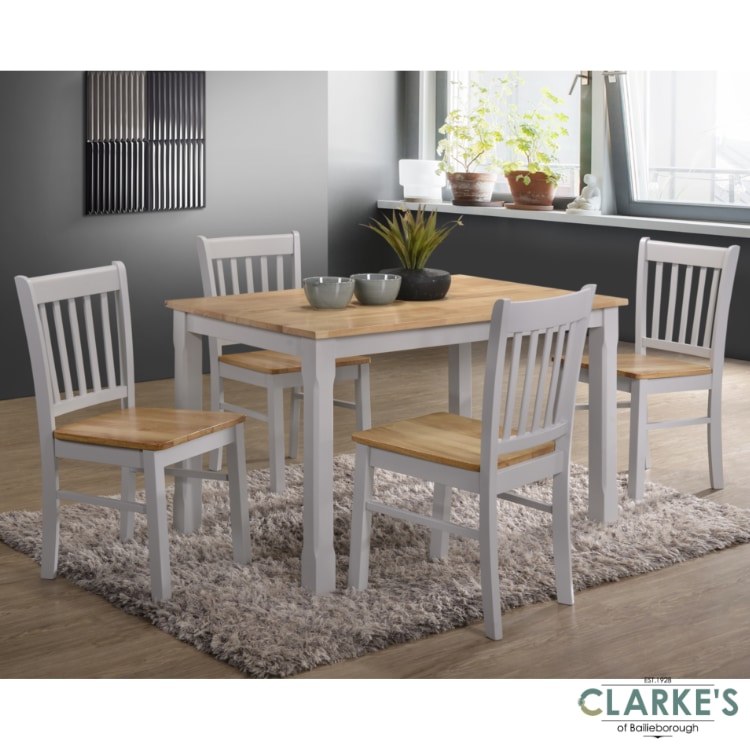 The Bolton Grey dining set adds elegance and sophistication to any home. Crafted from solid wood with an oak table top, contrasting beveled legs and four chairs with an elegant design, this piece will give your dining room a classic look. A perfect combination of style and value that's sure to create lasting memories around the dinner table.