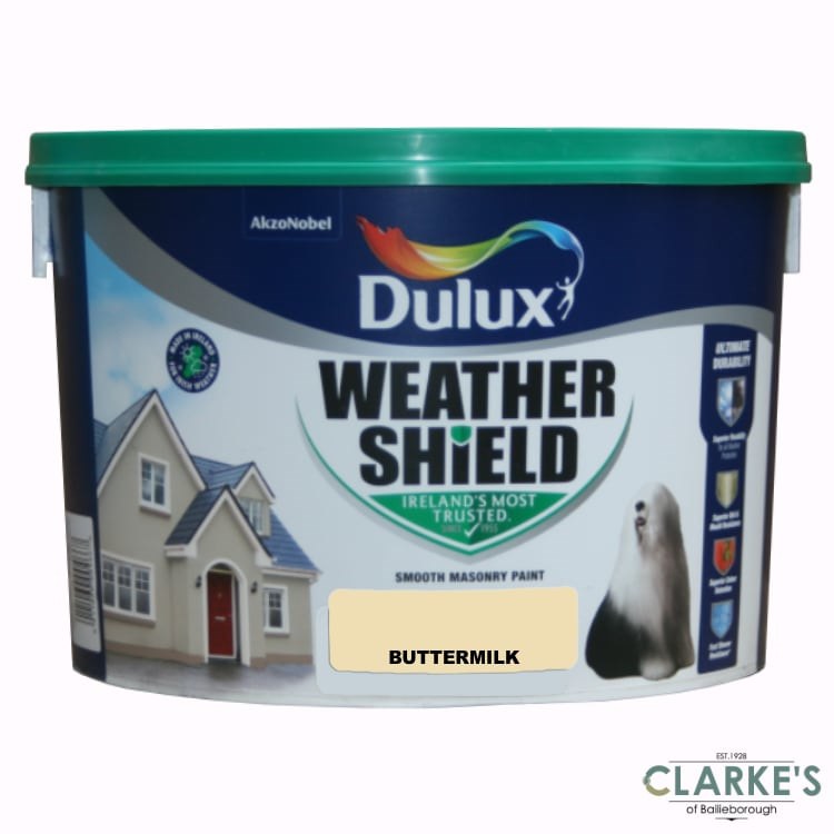 Dulux Weather Shield Buttermilk Smooth Exterior Masonry paint is Made in Ireland to protect Irish homes from our unique weather. The new Ultimate Durability formula with Superior Flexibility protects the paint from cracking and flaking, while Superior Colour Retention ensures colours stay true and Superior Mould Resistance works against mould and algae growth for longer thanks to slow-release encapsulated biocide technology. Dulux Weathershield Ultimate Durability is our most durable exterior paint ever.