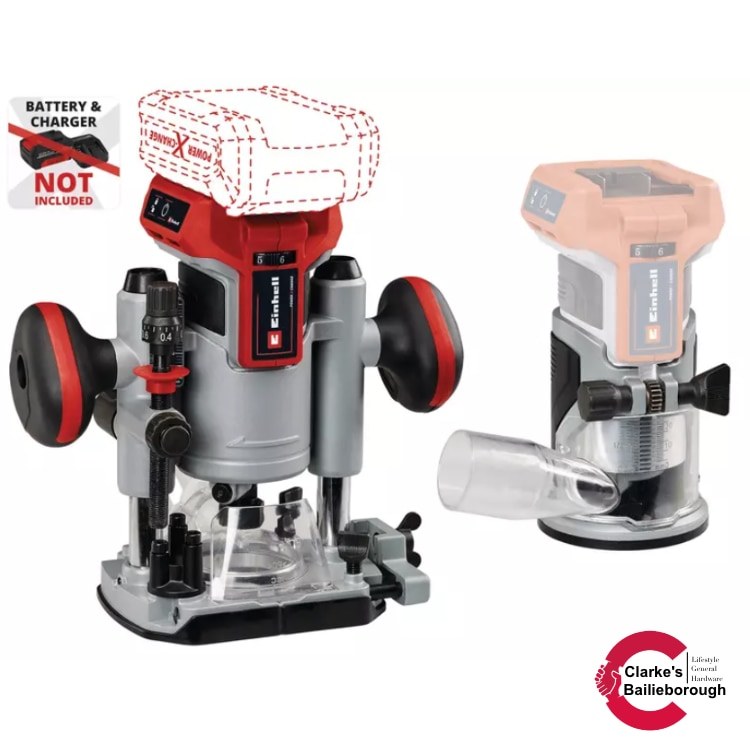 As a member of the Power X-Change family, the Einhell cordless router/trimmer TP-RO 18 Set Li BL Solo offers the freedom of cordless operation. The device is powered by the Einhell PurePOWER brushless motor. This brushless motor offers more power and a longer running time than conventional carbon brush motors. Together with a powerful motor, the variable speed control electronics can be perfectly adapted to any task in soft or hard wood. The cutting depth can be infinitely adjusted and features an additional fine adjustment. The depth adjustment is performed with a multi-setting turret stop. The router is equipped with a precise twin-tube guide, a clamp (6 mm and 8 mm), and a spindle lock for easy tool changes. The LED light ensures that the working area is perfectly illuminated. A plastic insert protects the surface of the workpiece. The soft grip handle makes for ergonomic and safe working, while the chip shield protects the user against wood chips in the field of vision, and the two-handed attachment helps to keep the unit under precise control during use. The edge trimmer base also allows edges to be beveled. The unit is supplied with a parallel stop, compass tip, a copy sleeve and assembly tool, along with an extraction adapter for Einhell wet and dry vacuum cleaners and a handy storage bag for clean and safe transport. This product comes without a battery or charger. These are available separately, for example as the practical PXC starter set.