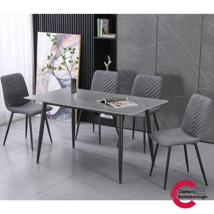 Elevate your dining space with the Essen Dining Set - featuring a sleek 140cm sintered stone tabletop, modern black legs, and four stylish grey chairs. Perfect for contemporary homes seeking a clean, coordinated look.