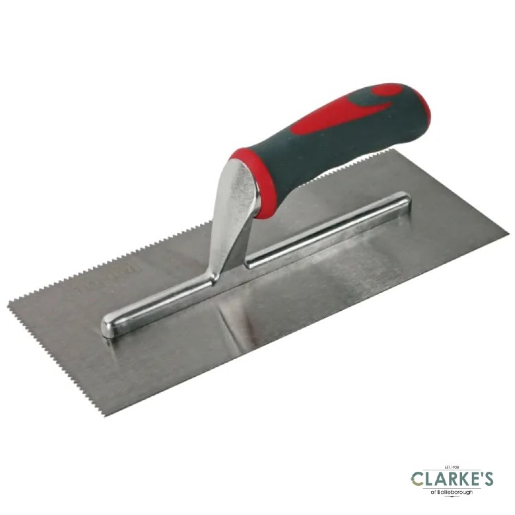 The Faithfull Notched mastic trowel which is specifically designed for the application of adhesive prior to the setting of tiles. The 3mm V-notched blade is ideal for applying wall tile adhesive and the two straight edges for finishing and cutting off. The blade is made from carbon steel for durability and a long working life and is fitted with a full size soft grip handle for user comfort.