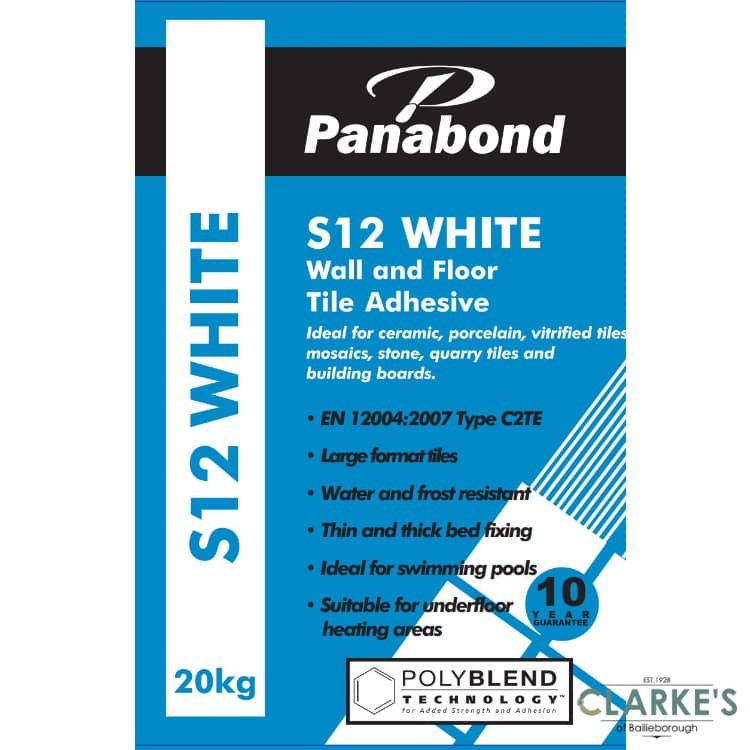 The Panabond S12 wall & floor tile adhesive is a regular setting cement-based, thin or thick bed tile adhesive, ideal for porcelain, vitrified and ceramic tiles, mosaics, stone, quarry tiles, building boards and underfloor heating areas. Conforms to EN 12004:2017-1 Type C2TE.