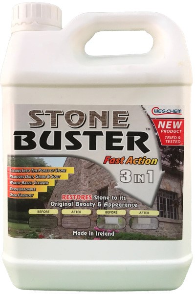 Stone Buster fast action 3 in 1. Restores stone to its original beauty and appearance. Cleans into the pores of all natural stone, removes dirt, grime and soot. Stone Buster is a biodegradable water based cleaner