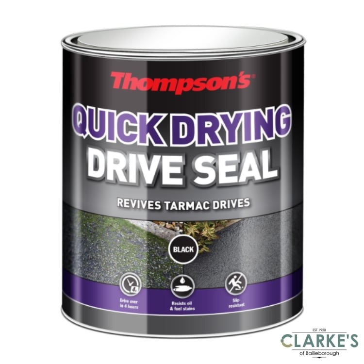 Thompson's Quick Drying Drive Seal will quickly revive old tarmac; restoring its colour and protecting it from oil and petrol stains. The drive seal dries in just four hours, when it can be driven on again. The seal is also slip resistant - helping to prevent accidents.