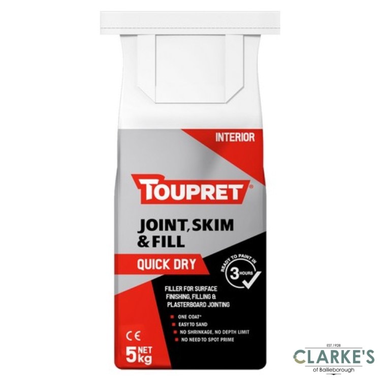 TOUPRET Joint Skim & Fill Quick Dry is suitable for surface finishing, filling and plasterboard jointing. It's ready to overpaint in just 3 hours, easy to sand, and can be applied in one coat with no shrinkage and no depth limit. Allowing you to get on with the job faster. Suitable for interior use. Conforms to BS EN 13963 for jointing applications.
