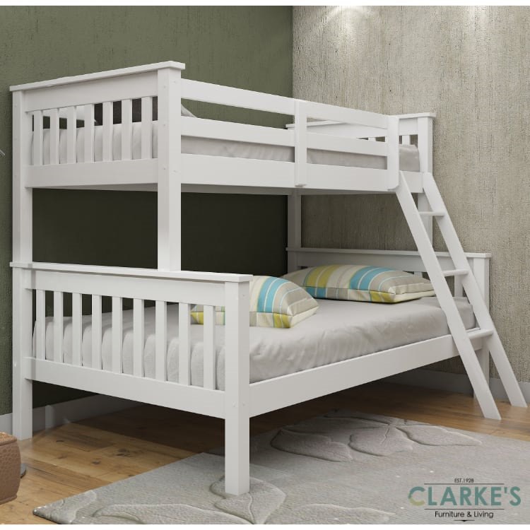 Triple white bunk bed. A single over double bunk bed, this triple bunk bed is a comfortable and space-saving solution, made to maximise the floor space of any bedroom. Available in grey, pine or white this comfortable, solid wood bunk bed is made to withstand the test of time.
