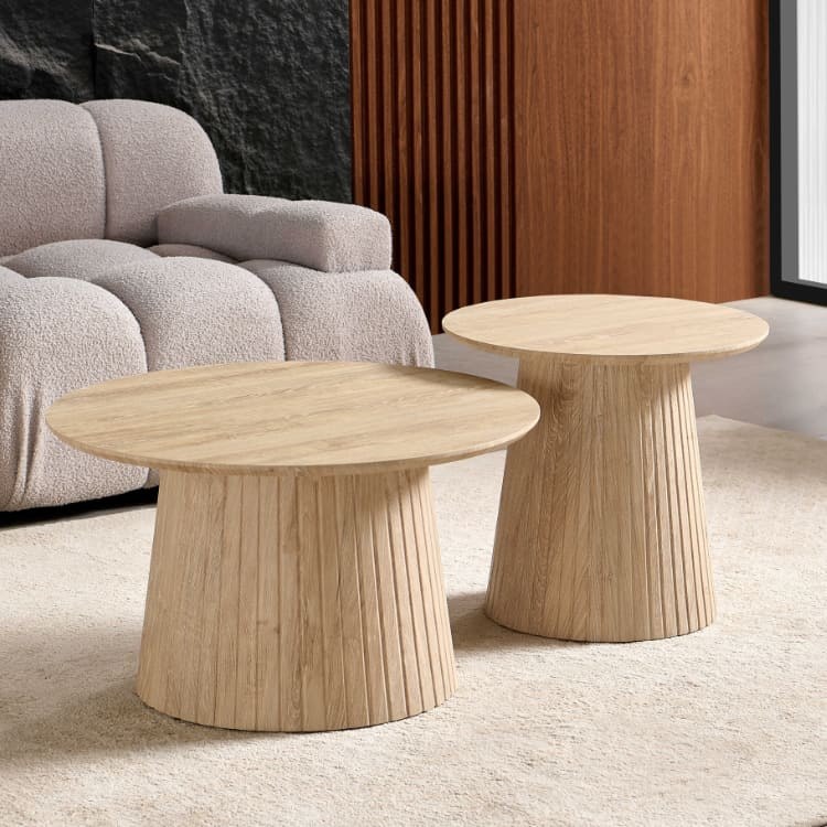 Add a touch of contemporary charm to your living room with the Valencia Coffee Table Set. This stylish pair of light wood tapered toadstool-style coffee tables brings warmth, texture, and versatility to any modern home.