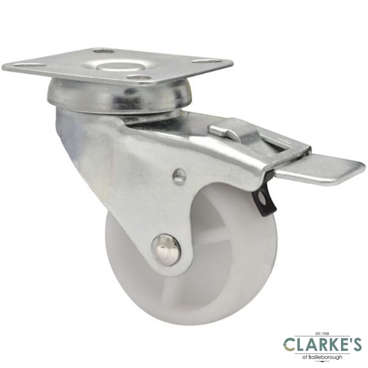 - Extraordinary equipment swivel castor with screw-on plate and brake.